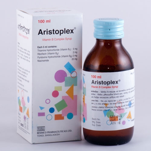 Aristoplex is a liquid preparation of Vitamin B Complex. Each 5 ml Aristoplex syrup contains :Thiamine Hydrochloride (Vitamin B1) BP 5 mg, Riboflavin (Vitamin B2) USP 2 mg, Pyridoxine Hydrochloride (Vitamin B6) BP 2 mg, Nicotinamide BP 20 mg