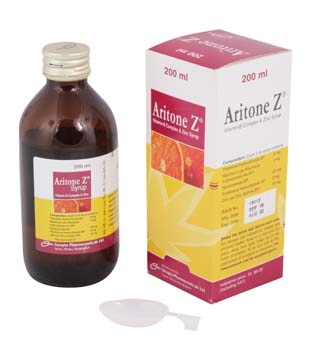 Aritone Z Syrup: Each 5 ml of syrup contains Thiamine Hydrochloride BP 5 mg, Riboflavin 5-Phosphate Sodium BP 2.74 mg equivalent to Riboflavin 2 mg, Pyridoxine Hydrochloride BP 2 mg, Nicotinamide BP 20 mg and Zinc Sulfate USP 27.45 mg equivalent to elemental Zinc 10 mg.
