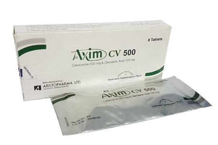 Axim CV 500 Tablet: Each film coated tablet contains Cefuroxime Axetil USP equivalent to Cefuroxime 500 mg and Diluted Potassium Clavulanate BP equivalent to Clavulanic Acid 125 mg.