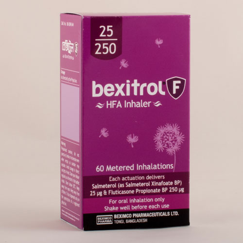 Bexitrol® F metered dose inhaler is a combination of Salmeterol Xinafoate BP and Fluticasone Propionate BP. Salmeterol Xinafoate is a selective, long acting beta-2 agonist used in the treatment of asthma and other forms of diffuse airways obstruction. Fluticasone Propionate is a corticosteroid with mainly glucocorticoid activity. Fluticasone Propionate is stated to exert a topical effect on the lungs without systematic effects at usual dose.