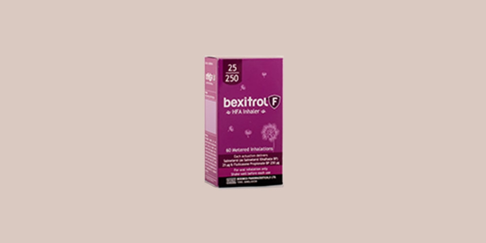 Bexitrol® F metered dose inhaler is a combination of Salmeterol Xinafoate BP and Fluticasone Propionate BP. Salmeterol Xinafoate is a selective, long acting beta-2 agonist used in the treatment of asthma and other forms of diffuse airways obstruction. Fluticasone Propionate is a corticosteroid with mainly glucocorticoid activity. Fluticasone Propionate is stated to exert a topical effect on the lungs without systematic effects at usual dose.