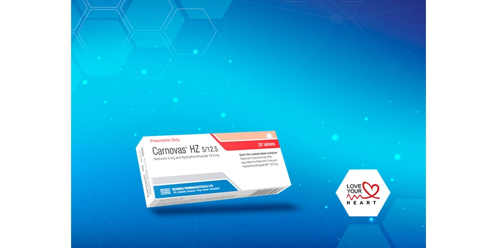 Carnovas HZ® (5/12.5 mg Tablet) is a single pill combination (SPC) antihypertensive consisting of 5mg nebivolol (a third generation beta blocker) and 12.5mg hydrochlorothiazide.