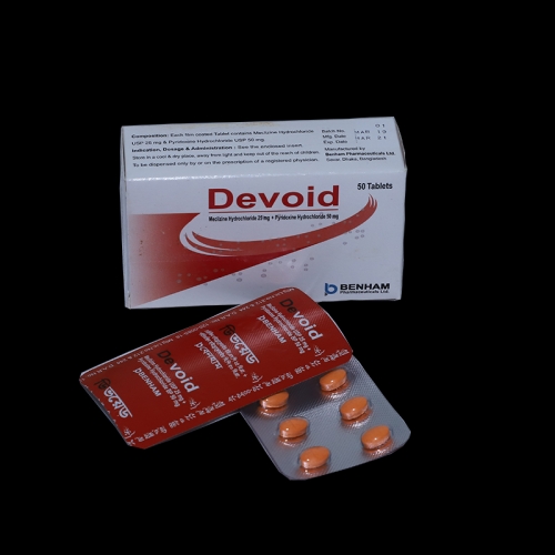 Devoid® tablet : Each film coated tablet contains Meclizine Hydrochloride USP 25 mg and Pyridoxine Hydrochloride USP 50 mg. Pharmacology: