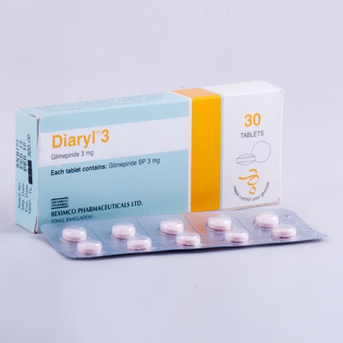 Diaryl® is a preperation of Glimepiride BP, which belongs to sulphonylurea class. The primary mechanism of action of Glimepiride is lowering of blood glucose by stimulating the release of insulin from functioning pancreatic beta cells. In addition, expancreatic effects may also play vital role in the activity of Glimepiride. Administration of Glimepiride can lead to increase sensitivity of peripheral tissues to insulin. After oral administration Glimepiride is completely (100%) absorbed from GI tract. When Glimepiride is given with meals, the mean Tmax is slightly increased (12%) and the mean Cmax and AUC are slightly decreased. Glimepiride is completely metabolized by oxidative biotransformation after oral dose.