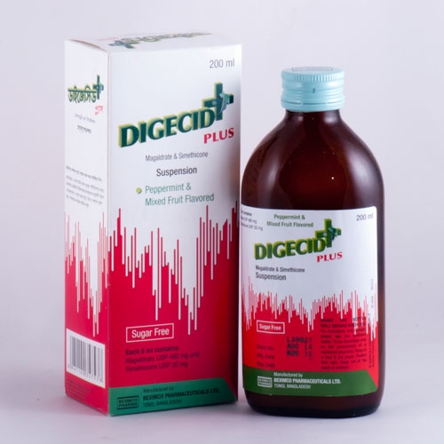 Digecid® Plus is a combination of Magaldrate and Simethicone. Magaldrate, a combination of Aluminium and Magnesium Hydroxide and Sulfates, neutralizes gastric acid extraordinarily quickly without raising the pH above 5-6. It also decreases the activity of pepsin in gastric secretion. Besides this, Simethicone, the another component, enables the gas bubble to coalesce and give relief from flatulence.