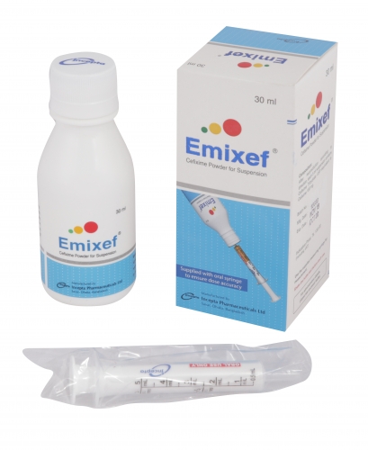 Emixef Powder for Suspension: After reconstitution according to direction, each 5 ml suspension contains Cefixime Trihydrate USP equivalent to Cefixime 100 mg.