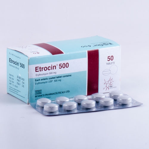 Etrocin® is highly effective in the treatment of a great variety of clinical infections caused by Erythromycin sensitive organisms. Upper respiratory tract infections: Tonsillitis, peritonsillar abscess, pharyngitis, laryngitis, sinusitis, secondary infections in cold and influenza. Lower respiratory tract infections: Tracheitis, acute and chronic bronchitis, pneumonia (lobar pneumonia, broncho-pneumonia, primary atypical pneumonia), bronchiectasis, legionnaire's disease. Ear infection: Otitis media and otitis externa, mastoiditis. Oral infection: Gingivitis, Vincent's angina. Skin and soft tissue infections: Boils and carbuncles, paronychia, abscesses, pustular acne, impetigo, cellulitis, erysipelas. Gastro-intestinal infections: Cholecystitis, staphylococcal enterocolitis. Prophylactic use: Pre and post-operative trauma, burns, rheumatic fever. Other infections: Osteomyelitis, urethritis, gonorrhoea, syphilis, lymphogranuloma venereum, diphtheria, prostatitis, scarlet fever.