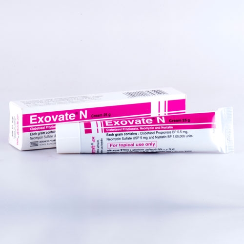 Clobetasol Propionate is a highly active corticosteroid with topical anti-inflammatory activity. The major effect of Clobetasol Propionate on skin is a non-specific antiinflammatory response, partially due to vasoconstriction and decrease in collagen synthesis. The use of Nystatin in the local treatment of candidal infections of the skin and of Neomycin as a broad-spectrum antibiotic is well known.Exovate® N cream is indicated in more resistant dermatoses such as recalcitrant eczemas and psoriasis (excluding widespread plaque psoriasis) where secondary bacterial or candidal infection is present, suspected or likely to occur, as when using occlusive dressings.