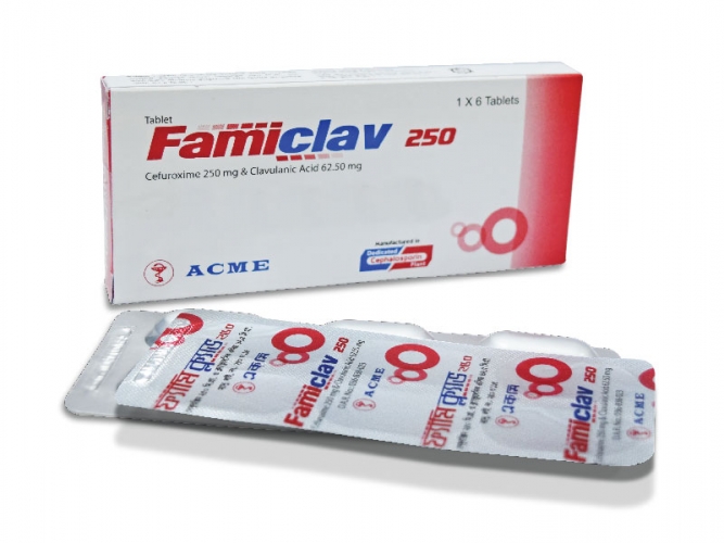Famiclav 250 Tablet : Each film-coated tablet contains Cefuroxime 250 mg as Cefuroxime Axetil USP and Clavulanic acid 62.50 mg as diluted Potassium Clavulanate BP.