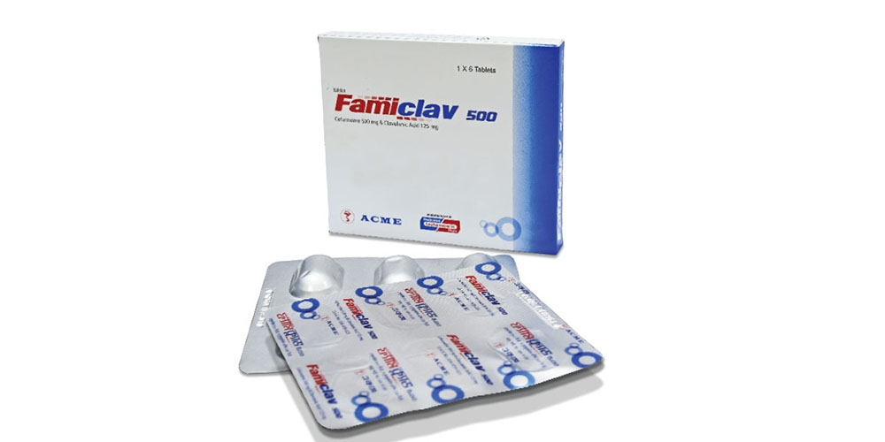 Famiclav 500 Tablet : Each film-coated tablet contains Cefuroxime 500 mg as Cefuroxime Axetil USP and Clavulanic acid 125 mg as diluted Potassium Clavulanate BP.