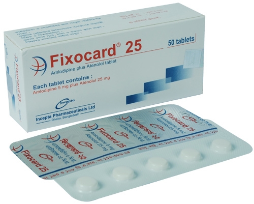 Fixocard 25 tablet: Each tablet contains Amlodipine Besilate BP equivalent to Amlodipine 5 mg and Atenolol BP 25 mg.