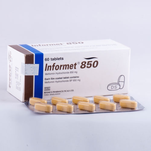Informet® 850 tablet: Initial dose is 850 mg tablet once or twice daily with or after meals, gradually increased if necessary to 2 to 3 g daily.