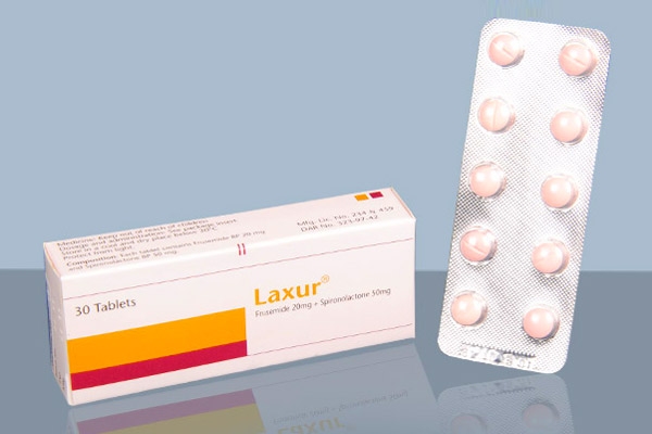 Laxur is a combination diuretic containing a loop diuretic, Frusemide and a potassium sparing diuretic, Spironolactone. Spironolactone and Frusemide have different but complementary mechanisms and sites of action. Therefore, when given together they produce synergistic or additive diuretic effects. The Frusemide component inhibits the Na+/K+/2Cl- cotransporter in the ascending Loop of Henle and blocks the reabsorption of sodium, potassium and chloride ions thereby increasing the quantity of sodium and the volume of water excreted in the urine. This characteristically induces potassium loss. The Spironolactone component inhibits the reabsorption of sodium in exchange for potassium at the distal tubule by antagonizing the action of aldosterone so that sodium excretion is greatly favored and the excess loss of potassium, induced by the Frusemide, is reduced.