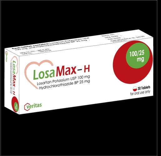 Losamax-H 100/25:: Each tablet contain Losartan Potassium USP 100 mg and Hydrochlorothiazide BP 25 mg.