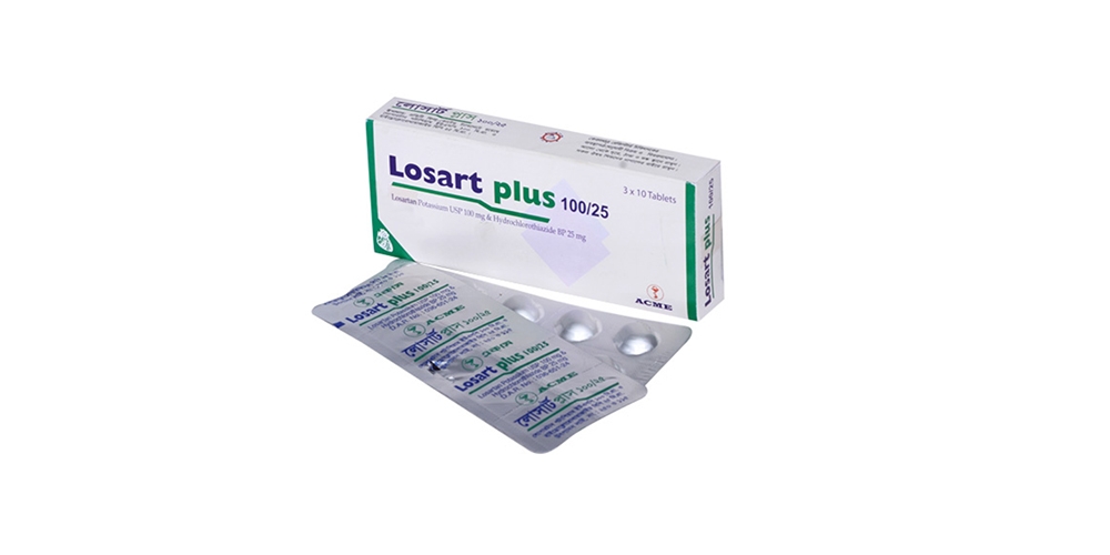 Dosage & Administration : Starting dose is Losart® Plus (50/ 12.5) one tablet once daily. More than two tablets of Losart® Plus (50/12.5) or one tablet of Losart® Plus 100/25 once daily is not recommended. Maximum Antihypertensive effect is attained about three weeks after initiation of therapy. Patients, whose blood pressure is not adequately controlled with losartan or hydrochlorothiazide monotherapy, may be switched to Losart® Plus (50/12.5) once daily. If blood pressure remains uncontrolled after about three weeks of therapy, the dose may be increased to one tablet of Losart® Plus 100/12.5 or two tablets of Losart® Plus (50/12.5) or one Losart® Plus 100/25 once daily. Patients, whose blood pressure is not adequately controlled with losartan 100 mg monotherapy, may be switched to Losart® Plus 100/12.5 once daily. If blood pressure remains uncontrolled after about three weeks of therapy the dose may be increased to two tablets of Losart® Plus (50/12.5) or one Losart® Plus 100/25 once daily.