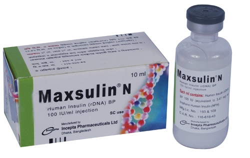 Maxsulin N injection 100 IU: Each box contains 10 ml glass vial. Each ml suspension contains Human Insulin (rDNA) BP 100 IU (equivalent to 3.47 mg) as Isophane Human Insulin (NPH).