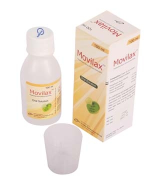 Movilax Oral Solution: Each box contains 100 ml concentrated oral solution in HDPE bottle with a measuring cup.