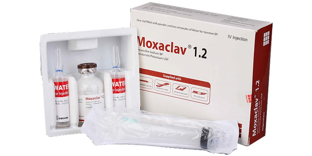 Moxaclav® 1.2 IV Injection: Pack of 1 vial containing sterile drug mixture accompanied by two solvents ampoule of 10 ml water for injection in each. It also contains a complementary pouch comprised of disposable syringe (20 ml), butterfly needle, alcohol pad & first aid bandage.