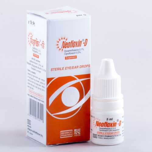 Dexamethasone is glucocorticoid. It has an anti-inflammatory and anti-allergic action.Ciprofloxacin has cidal and inhibitory activities against bacteria which result from an interference with DNA gyrase, an enzyme needed by the bacterium for the synthesis of DNA.This combination eye drop is indicated for the treatment of steroid responsive inflammatory ocular conditions where bacterial infections or risk of bacterial infections co-exist. It is also indicated for the treatment of ear infections accompanied by inflammation such as otitis externa, otitis media and chronic suppurative otitis media etc. Neofloxin®-D Eye/Ear Drops: Plastic dropper bottle contains 5 ml sterile suspension each ml contains Dexamethasone USP 1 mg and Ciprofloxacin Hydrochloride USP equivalent to Ciprofloxacin 3 mg.