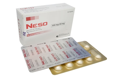 Neso Tablet (500 mg/20 mg): Each enteric coated tablet contains Naproxen BP 500 mg & Esomeprazole Magnesium Trihydrate USP equivalent to Esomeprazole 20 mg.