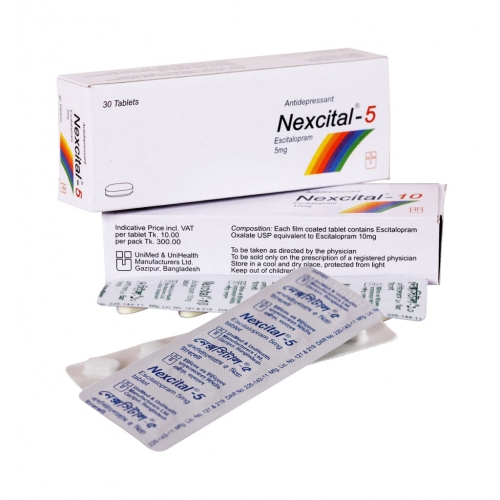 Nexcital-5 tablet: Green, parallel capsule shaped, film coated tablet; each tablet contains Escitalopram Oxalate INN equivalent to Escitalopram 5 mg.