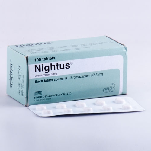 Nightus® Tablet contains Bromazepam BP 3 mg. It is an anxiolytic with smooth and superior efficacy. Unlike benzodizepines it has least side effects. Bromazepam reaches peak plasma concentrations within two hours after oral administration. Bromazepam is metabolized in the liver. It effectively removes anxiety and related various physiological problems. Nightus® is indicated for emotional disturbances such as anxiety and tension states, functional disturbances of the cardiovascular and respiratory systems, functional disturbances of gastrointestinal tract, other psychosomatic disturbance such as psychogenic headache.