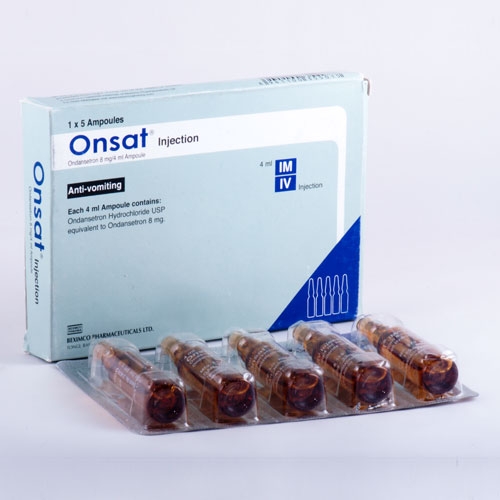 Onsat® is an anti-emetic drug. Each ampoule contains Ondansetron Hydrochloride USP equivalent to Ondansetron 2 mg/ml. Onsat® is indicated for the prevention and treatment of post-operative nausea and vomiting and for the management of simple nausea and vomiting