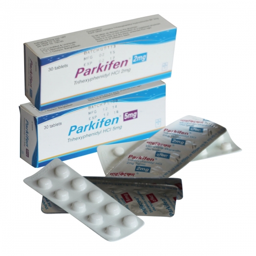 Parkifen 2 tablet: White, round shaped, bi-convex tablet; each tablet contains Trihexyphenidyl HCl BP 2mg.