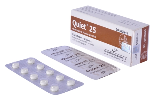 Quiet 25: Each film coated tablet contains Quetiapine Fumarate INN 28.728 mg equivalent to 25 mg of Quetiapine.