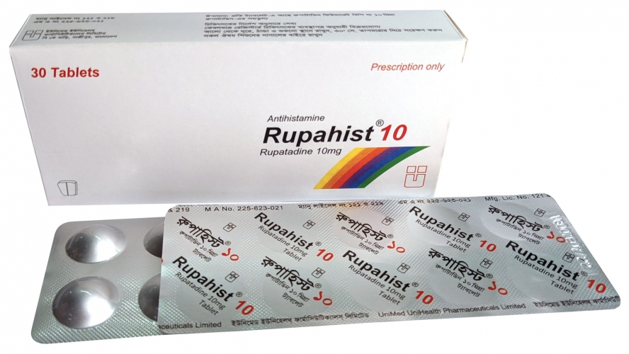 Rupahist® 10 tablet: Round, orange coloured tablet; Each tablet contains Rupatadine Fumarate BP equivalent to Rupatadine 10 mg.