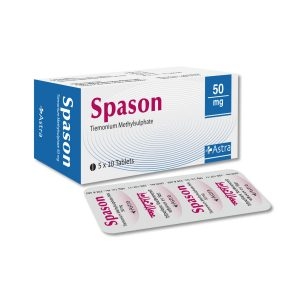 TiemoniumMethylsulphate is quaternary ammonium antimuscarinic agent with peripheral effect similar to those of atropine. It strengthens calcium bonding with phospholipids and proteins thus stabilizing the cell membrane of the GI tract. It is absorbed from intestines. The half-life is 3 hours after oral administration. It is fastly eliminated in renal way and bile duct. Composition: Spason Tablet: Each film coated tablet contains TiemoniumMethylsulphate INN 50 mg. Indication: Spason is indicated for the treatment of muscle spasms of the intestine, biliary system, bladder and uterus. It is also indicated for pain in gastrointestinal and biliary diseases and in urology and gynaecology such as gastroenteritis, diarrhoea, dysentery, biliary colic, enterocolitis, cholecystitis, colonopathies, mild cystitis and spasmodic dysmenorrhoea. Dosage and administration: The usual dose is 2 to 6 tablets (100 mg – 300 mg) per day in divided dose as required. Side effect: Side effects include dryness of mouth, difficulty with micturition and constipation, risk of hypotension & tachycardia, occasional retention of urine in excessive or over doses. Contraindication: The drug should not be used in glaucoma, difficulty to urinate, tachycardia, myocardial infarction, pyloric stenosis and acute edema of the lung.
