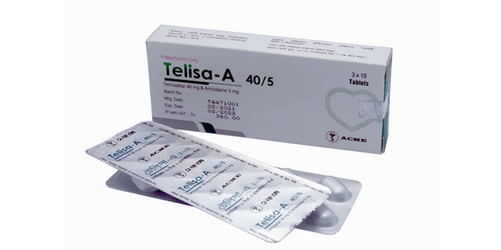 Telisa-A 40/5 Tablet: Each tablet contains Telmisartan USP 40 mg & Amlodipine Besilate BP equivalent to Amlodipine 5 mg.
