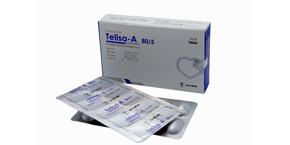 Telisa-A 80/5 Tablet: Each tablet contains Telmisartan USP 80 mg & Amlodipine Besilate BP equivalent to Amlodipine 5 mg.
