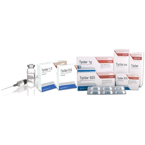 Tyclav® (375 mg Tab, 625 mg Tab, 1 g Tab, 100 ml Susp, 50 ml bid, 0.6 gm Inj and 1.2 gm Inj) is an antibacterial combination consisting of amoxicillin and the beta-lactamase inhibitor, clavulanate potassium.