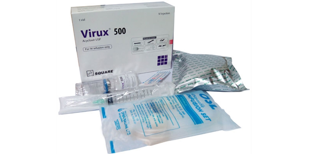 Virux® 500 IV Injection: Each combipack contains one vial of Acyclovir 500 mg accompanied with 100 ml 0.9 % Sodium Chloride solution (SoloTM), one infusion set, one alcohol prep. pad, one first aid band & one 10 ml sterile disposable syringe.