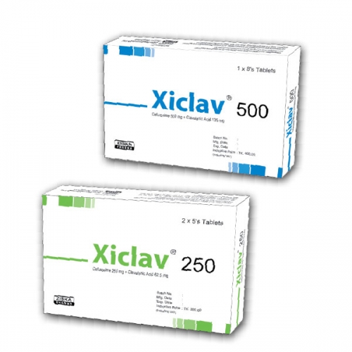 Xiclav® 500mg Tablet: Each box contains 1x10's tablets in Tropical blister (Alu-PVC-Alu) pack. Xiclav® Granules for Suspension: Each carton contains a large bottle containing Cefuroxime and Clavulanic acid dry granules for reconstituting 70 ml of suspension and a small bottle containing diluents along with a measuring cup, a spoon and a dropper